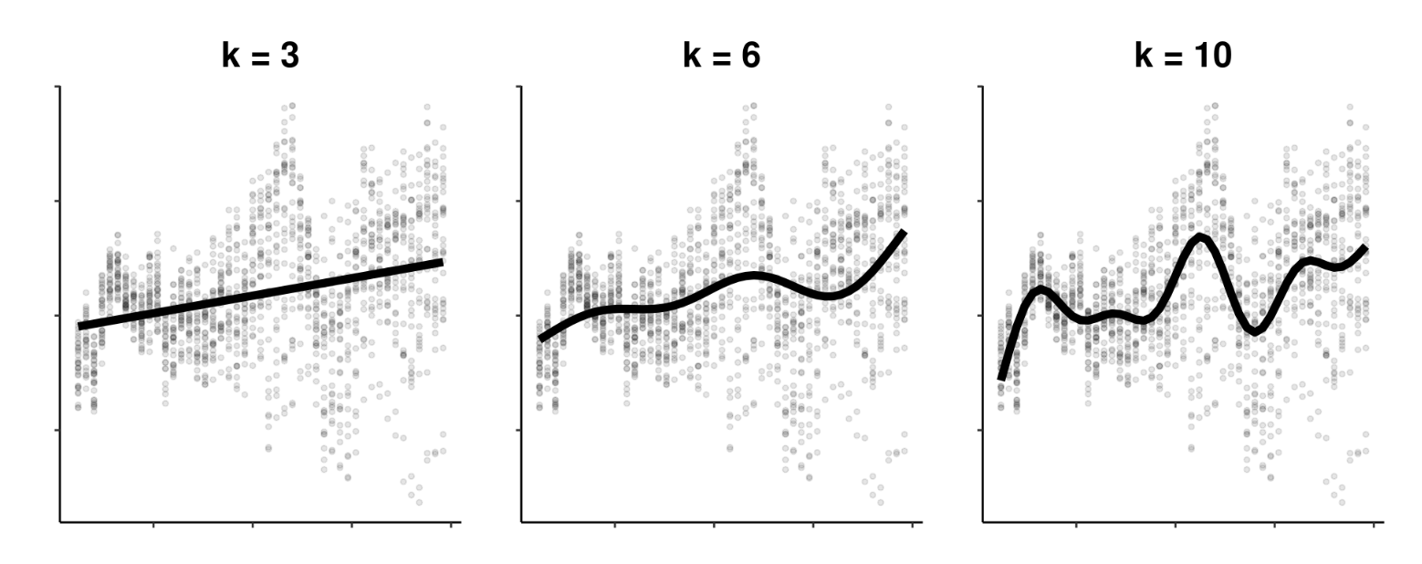 In addition to changing the value of k, we can change whether our spline is penalized, and this choice interacts to an extent with k.