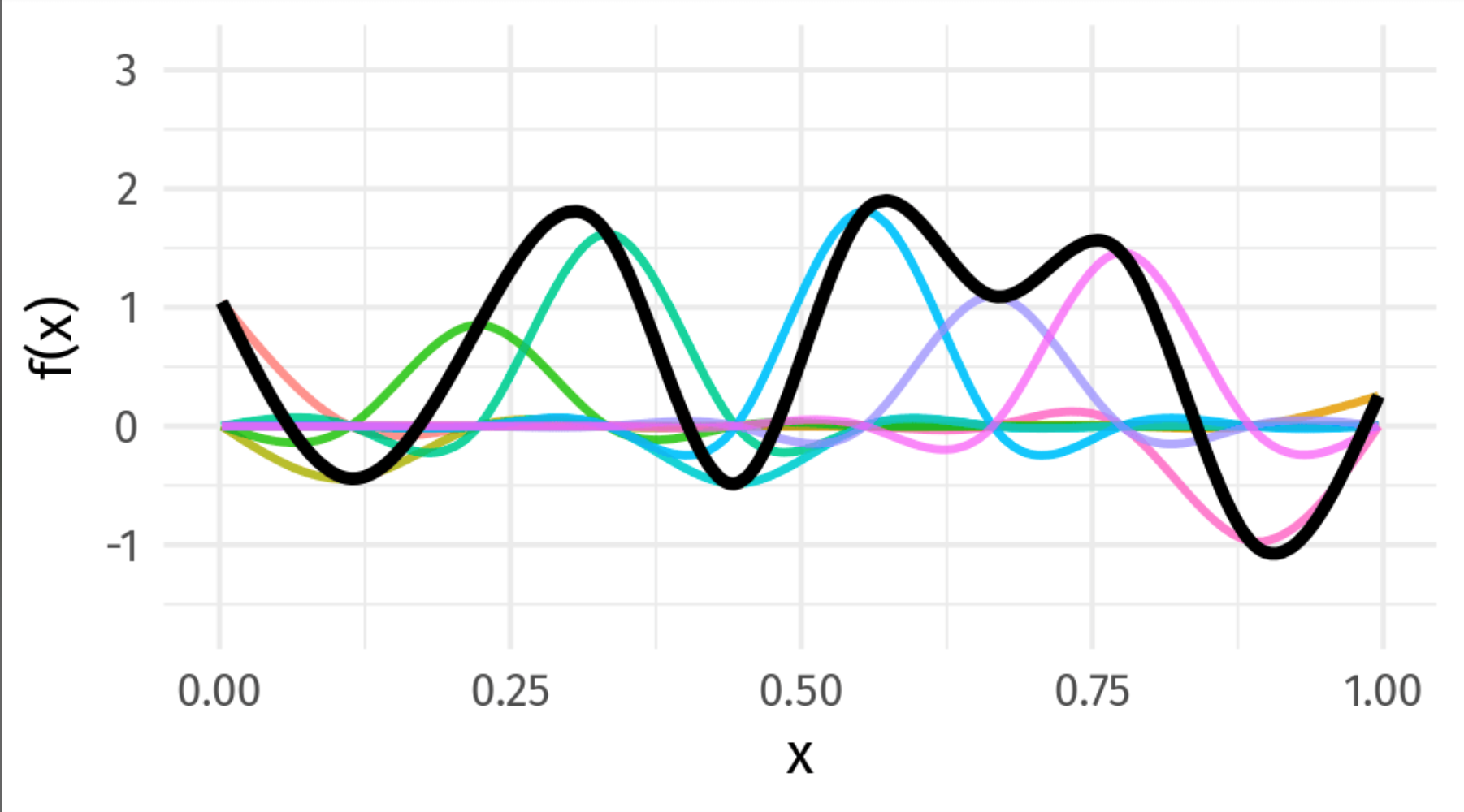 The smooth term for age produces an age spline. Here, the spline for age is derived from a combination of (simpler) basis functions, which can take on different functional forms – from linear, to polynomial, to very squiggly. Hence, splines are functions defined by the sum of simpler functions called basis functions. As an example, in the image below, the black line is a fitted spline and the colored lines are basis functions that comprise the resultant fitted spline.
