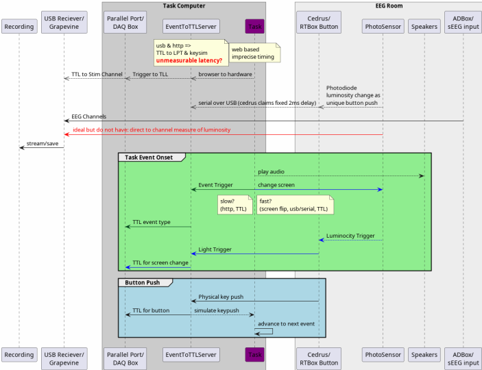 Precise screen flip and button push timing is important eeg and seeg, but the browser based task does not have any display timing guarantees. We use the Cedrus or RTBox response box's photodiode to forward screen luminosity changes to the TTL channel.